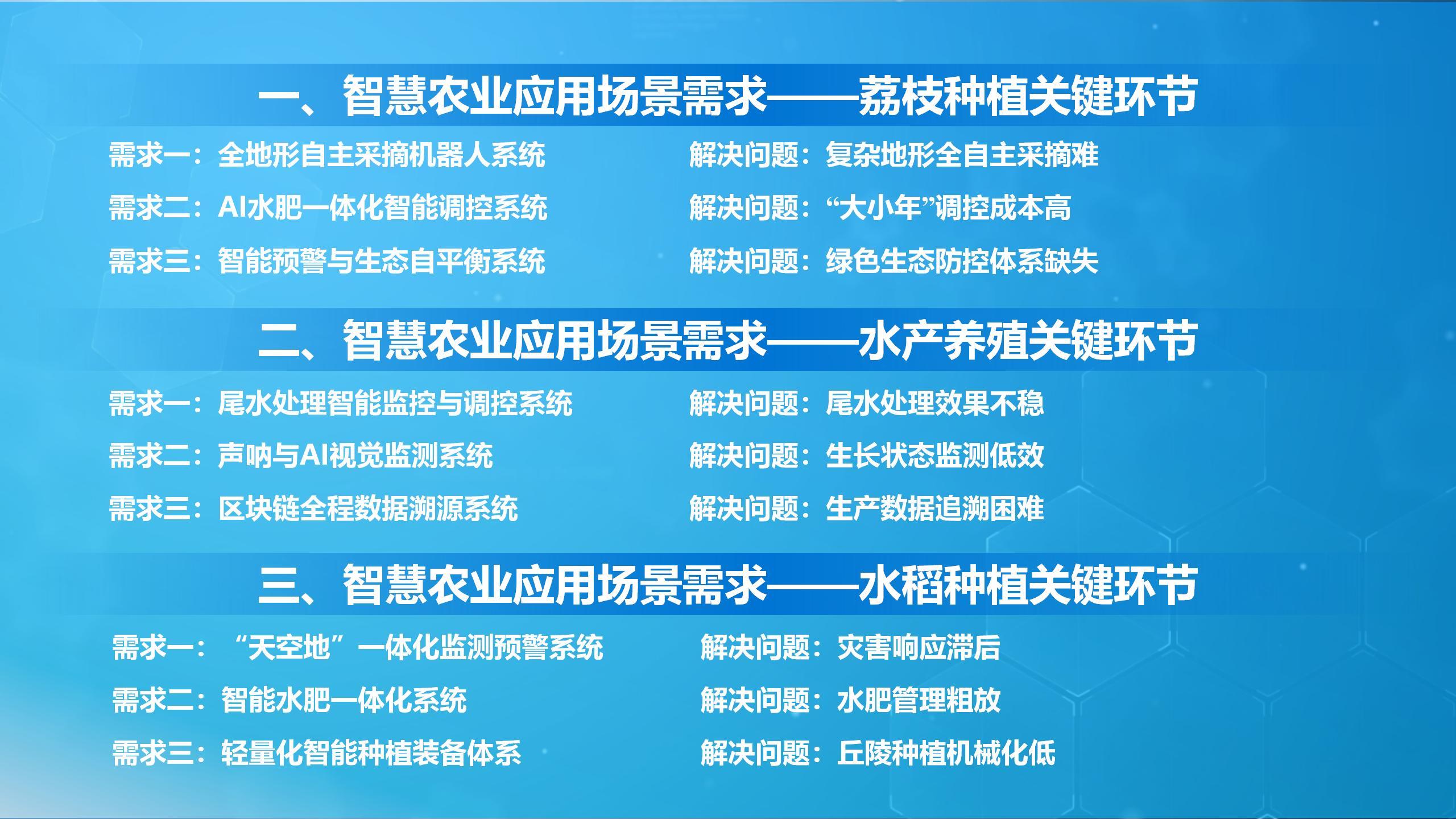 本次大会鲜明体现了“场景驱动”的思路。现场发布16项智慧农业典型案例,还围绕荔枝、水产、水稻三大广东特色优势产业,精准遴选了9项关键环节的智慧农业应用场景需求清单。